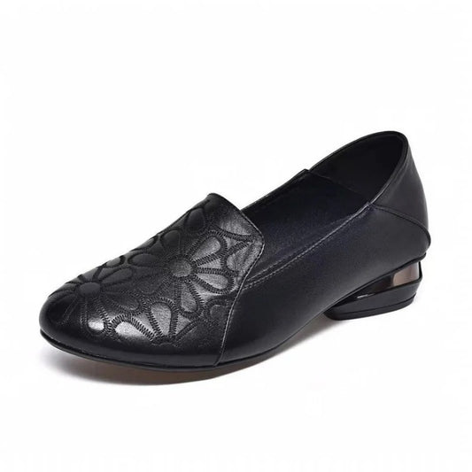Women’s Leather Shoes with Thick Heel and Floral Patchwork