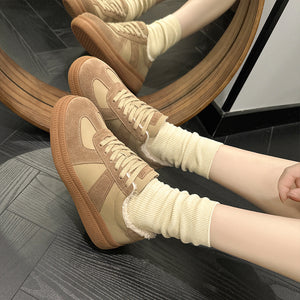 Crafted with a chic mix of suede and PU panels, these sneakers elevate casual outfits effortlessly. The neutral beige and camel tones complement jeans, leggings, or athleisure wear—making them your go-to choice for errands, city strolls, or cozy weekends at home.