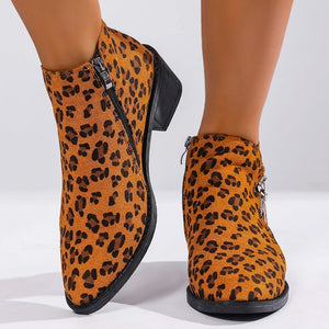 The leopard print texture adds a bold, timeless touch that pairs beautifully with jeans, skirts, or leggings. Featuring a side zipper closure, these boots are easy to slip on and off while maintaining a snug, supportive fit. The mid-height block heel offers posture-enhancing lift without compromising comfort or balance — perfect for women who want both style and stability in their everyday footwear.