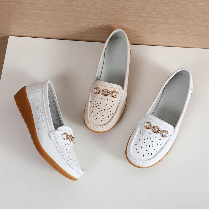 Made from premium cow leather, these flats are both durable and breathable, keeping your feet cool and dry even during extended wear. The laser-cut perforations enhance airflow, while the lightweight, flexible outsole allows for smooth movement with every step. The non-slip rubber sole ensures added safety on various surfaces, making these a reliable go-to for daily wear.